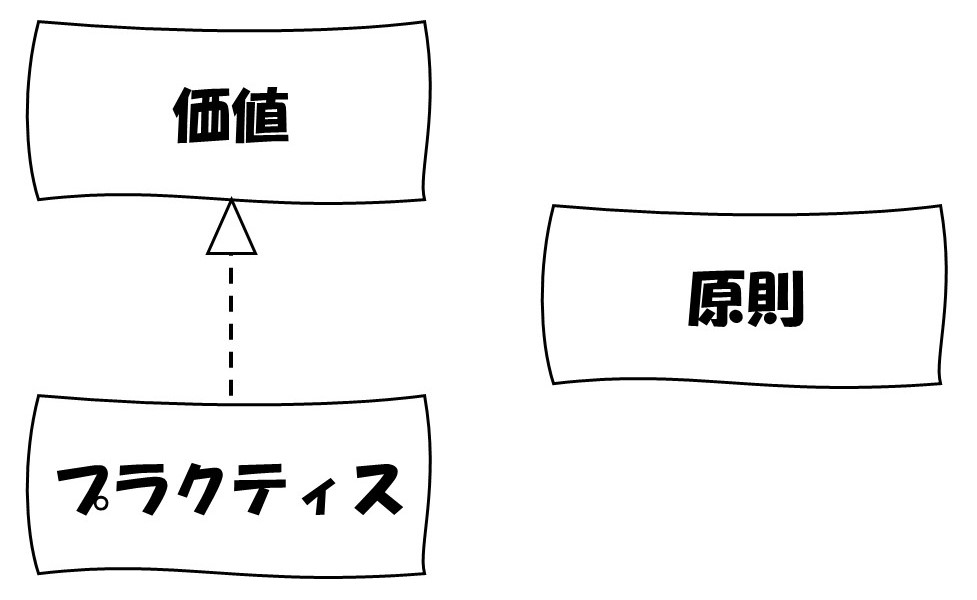 #XPには、「価値」「原則」「プラクティス」という3つの概念があります。後続の記事で、このそれぞれを解説していきますので、まずはこの全体像を把握してください。