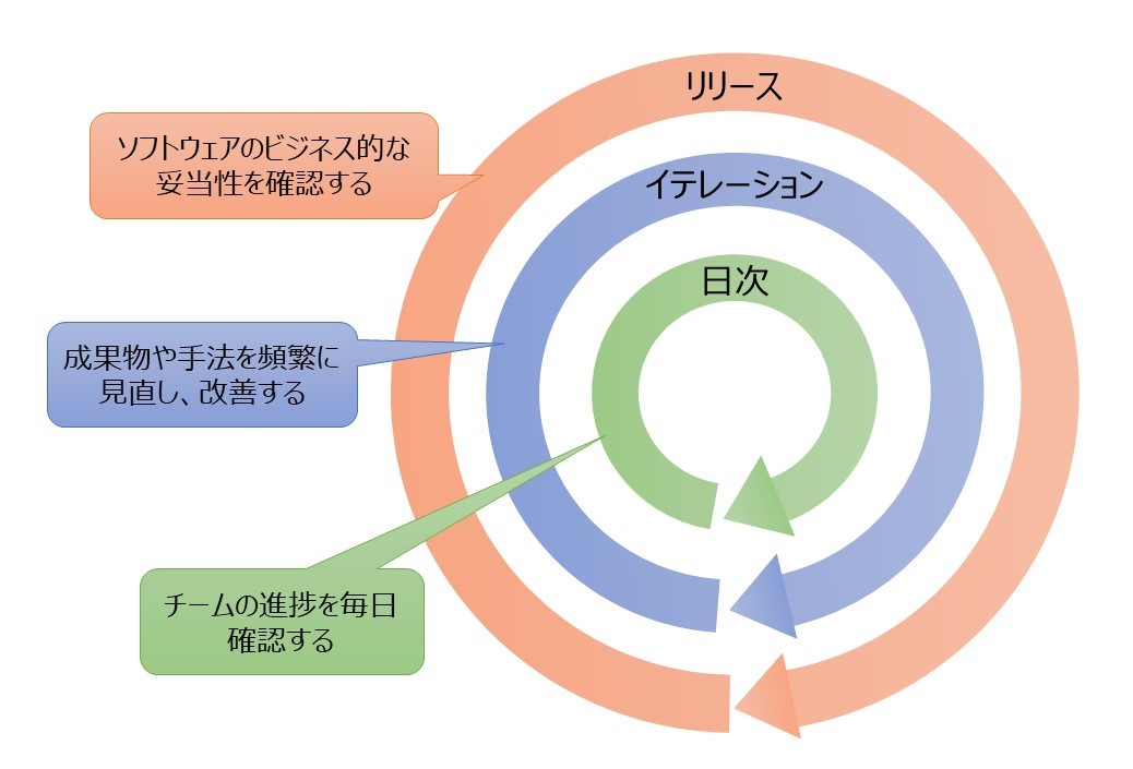 上の図では一番わかりやすい日次/イテレーション/リリースの繰り返しを挙げましたが、これ以外にもアジャイル開発ではあちこちでフィードバックループが回っています。例えば、継続的インテグレーションはチームとシステム間のフィードバックの仕組みですし、テスト駆動開発は今自分が作っているコードとの対話(フィードバックループ)です。