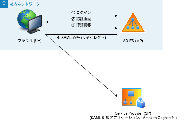 #多くの SSO 製品では、SAML フェデレーション機能が用意されています。そして、Microsoft の Active Directory では、Active Directory フェデレーション サービス (AD FS) があるため、SAML の IdP (Identity Provider) として機能させることができます。
