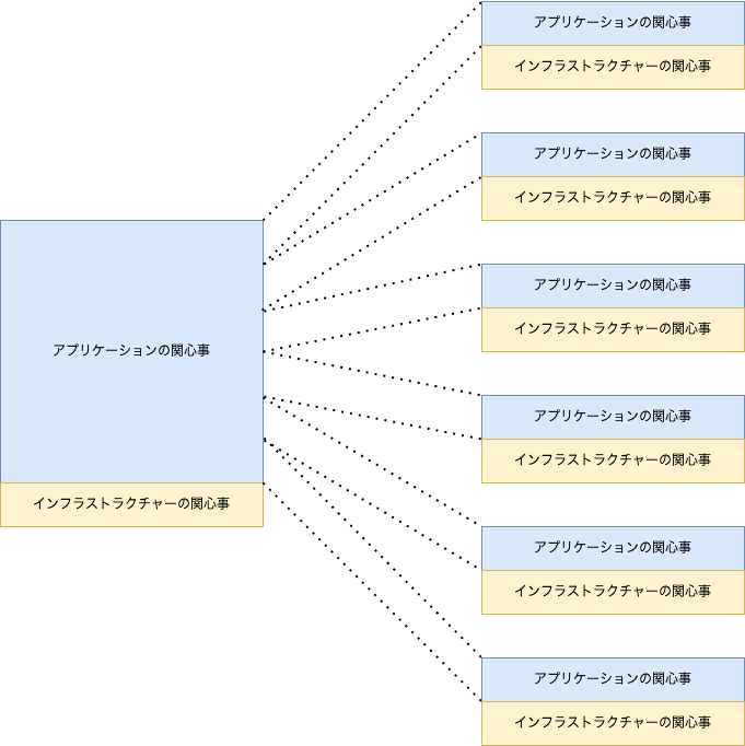 アプリケーションコードは、ドメインであるアプリケーションの関心事を実装したコードと認証認可や可観測性などの横断的関心事を含むインフラストラクチャーの関心事を実装したコードから構成されています。