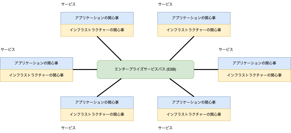 これによってサービス間の複雑な通信に関連した課題を解決することにつながってきました。前述のインフラストラクチャーの関心事のコードをサービスから切り離して、ESB の機能で実現できました。