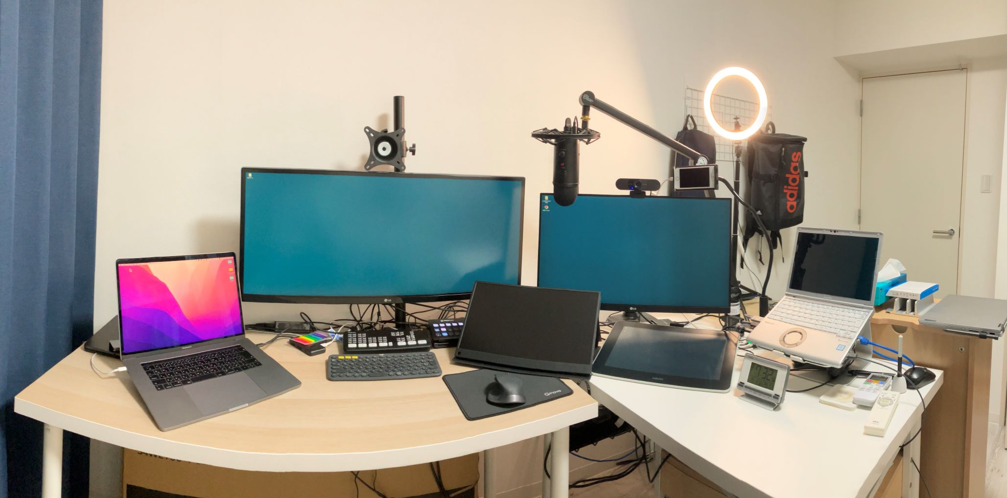 今回、HDMIソースとして、iPhone、iPad、Let's note、別のWindowsノートPCを接続しました。通常時は、Let's noteの外部ディスプレイの内容を共有します。PDFを表示したいときはiPadに切り替え、書籍紹介で本の表紙を生で見せたいときには、iPhoneの映像に切り替えていました。ちなみに、HDMIスプリッターも使っているので、Let's noteに接続した外部ディスプレイ、液晶ペンタブレット、ATEM Miniへの入力はすべて同じ映像になります。