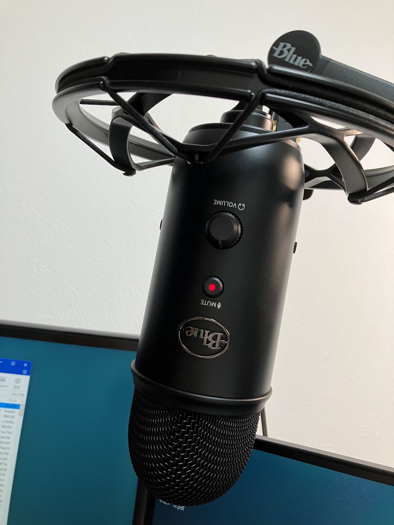 #ノートPCのスピーカーだと音質がイマイチですし、一日中ヘッドセットをつけていると頭が痛くなってくるので、思い切って外付けのマイク(Blue yeticaster)を購入しました。非常に良い性能です。性能が良すぎるあまり、環境音もバッチリ拾ってくれます(笑)。