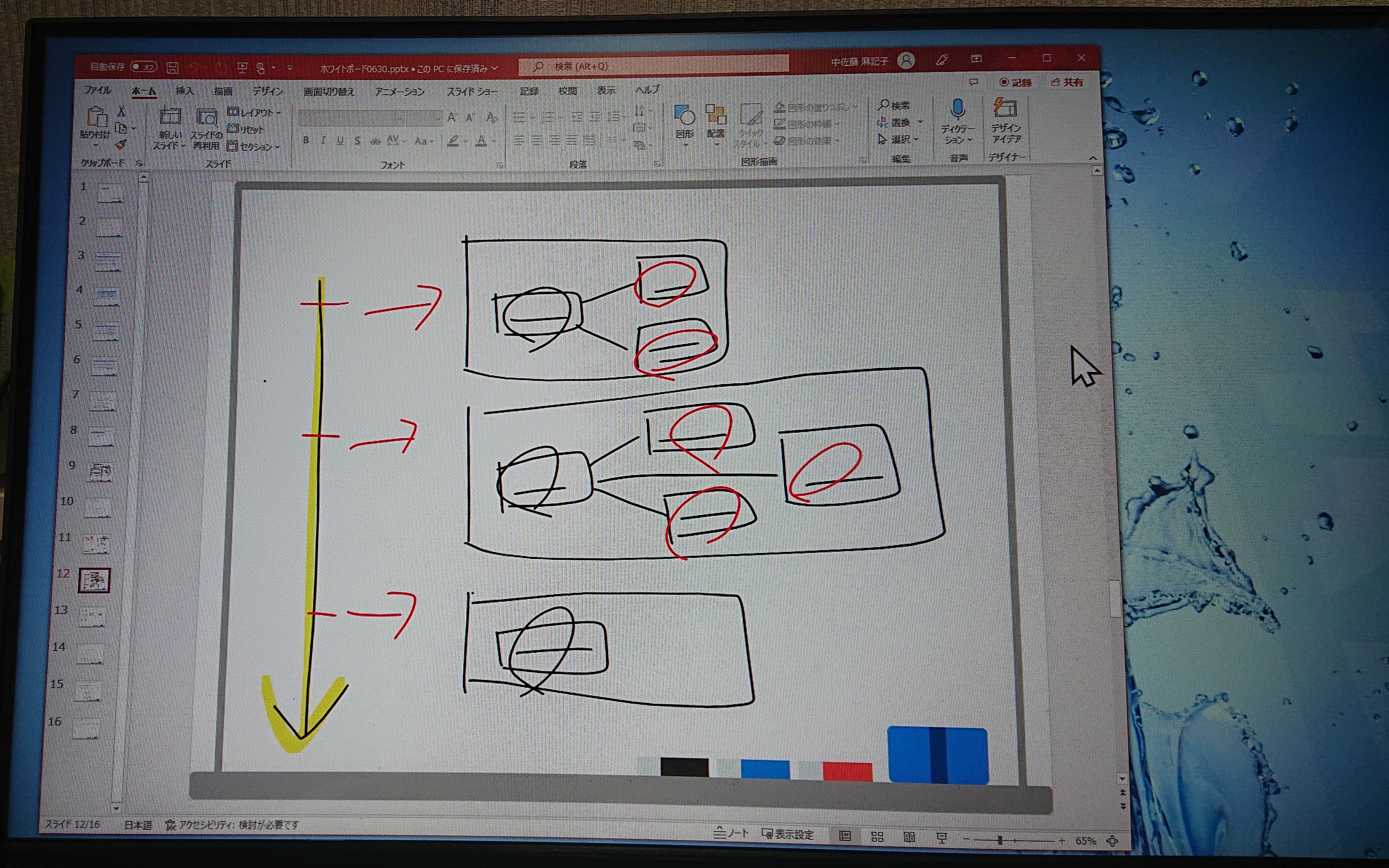 最初の写真の右側のモニターは、タッチパネルです。重いモニターは前述の理由で諦めましたが、これはいいかも、と購入。研修や講演で画面共有をしてスライドに書き込んだり、ホワイトボード代わりに使っています。