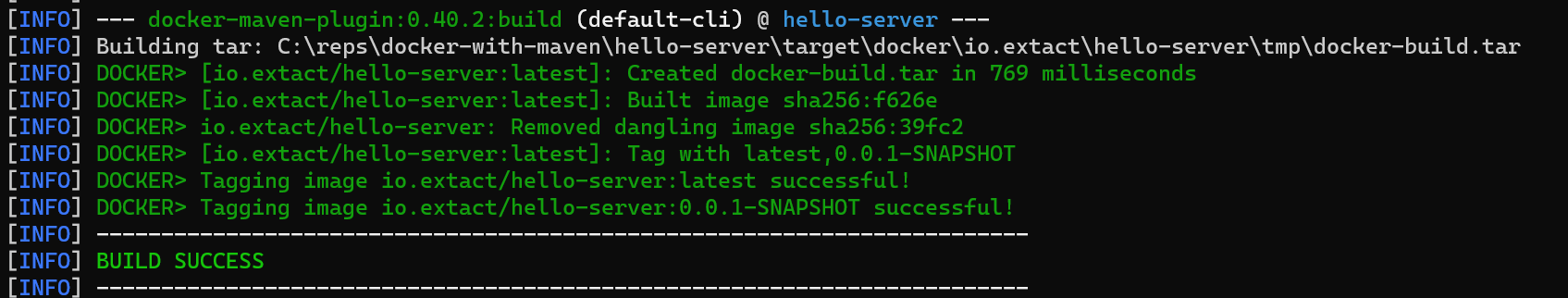 dockerプラグインはどのフェーズにも割り当てていないので、コンテナイメージのビルド実行には次のようにdockerプラグインのbuildゴールを直接指定します。
