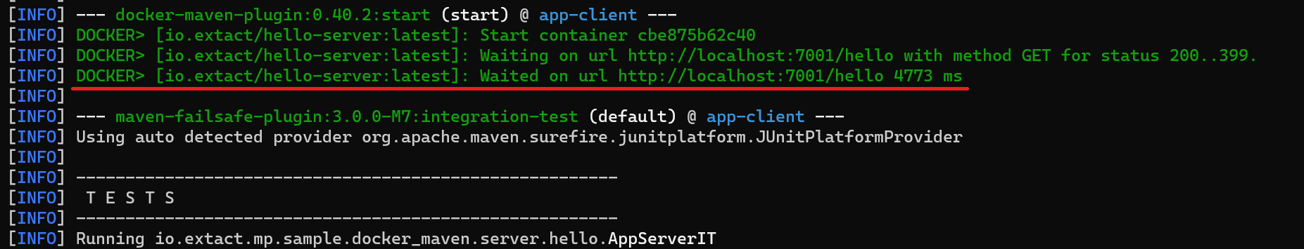 コンテナがテスト実行前に起動するようになりましたが、このままでは起動後、すぐに次のフェーズのintegration-testフェーズが実行されてしまいます。integration-testフェーズでコンテナを使ったテストをしたいのですが、コンテナの起動完了は待ってくれないため、場合によっては、というよりもほぼすべての場合で、コンテナ起動中にテストが実行されflakyな状態となりテスト結果が安定しません。