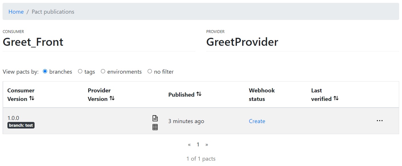 Pactを登録すると、UI上からも内容を確認できます。この段階ではConsumer側から登録した状態ですので未検証の状態(Verified欄が空白)で表示されているかと思います。
