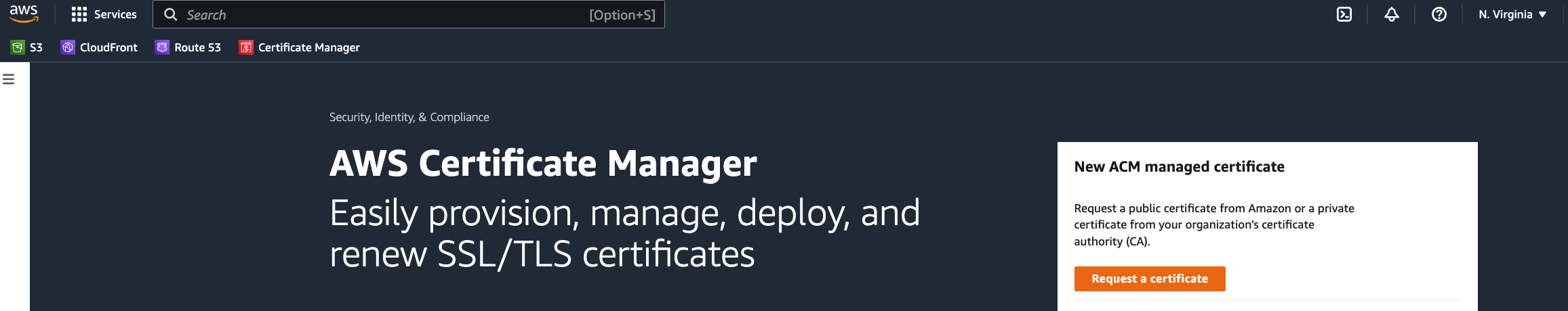画面右上のリージョンが「N. Virginia(米国東部(バージニア北部))」になっていることを確認し、「Request a certificate」を選択します。