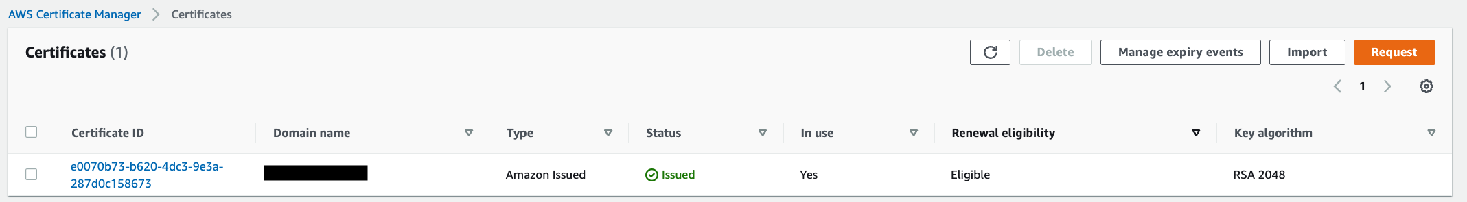 証明書の発行には結構な時間がかかります(数時間)。その間のステータスは「Pending validation(検証待ち)」となります。これが「Issued(発行済)」になればOKです。