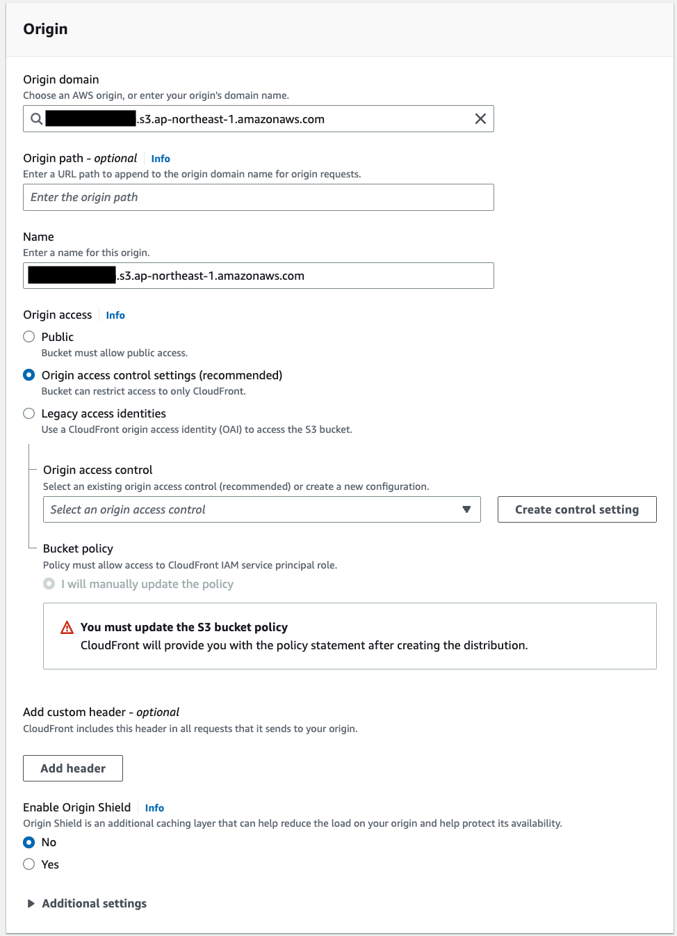 #S3の設定が正しく出来ていれば、Origin domainの選択肢として[作成したバケット名].s3.amazonaws.comが表示されますので、これを選択します。選択するとNameに値がセットされます。