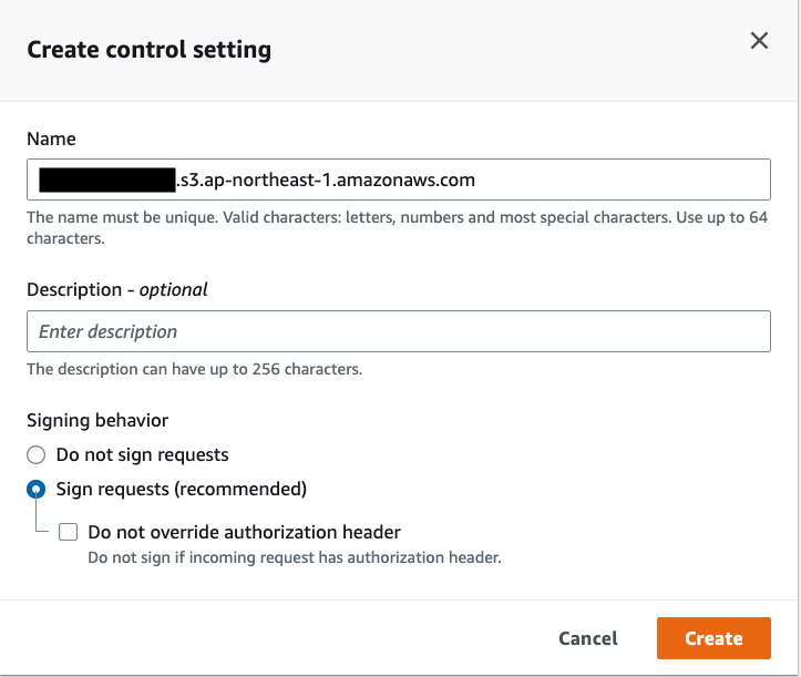Origin accessはデフォルトで「Public」となっていますが、「Origin access control settings (recommended)」を選択します。これにより、S3バケット(オリジン)へのアクセスを特定のCloudFrontディストリビューションからのアクセスのみに制限することができます。本項目を選択すると「Create control setting」のボタンが表示されるので、選択すると以下のダイアログが表示されます。特に変更せずにCraeteを選べばOKです。
