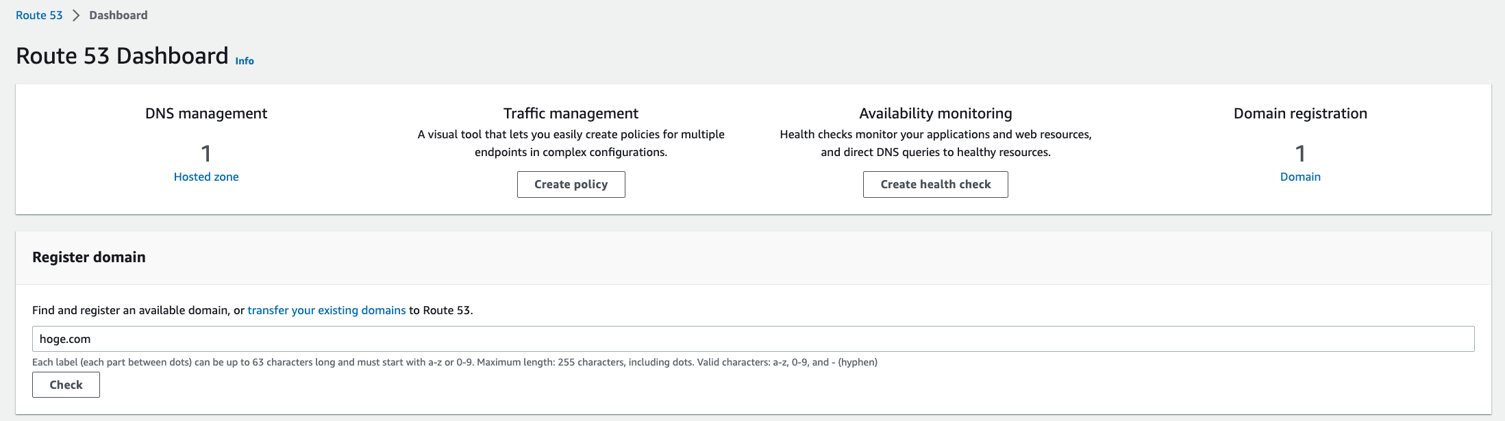 #サイトを公開するにあたって、ドメインが必要となります[1]。AWSコンソールからRoute 53のダッシュボードを開き、「Register domain」内の入力欄に取得したいドドメイン名を入力し、Checkを選択します。