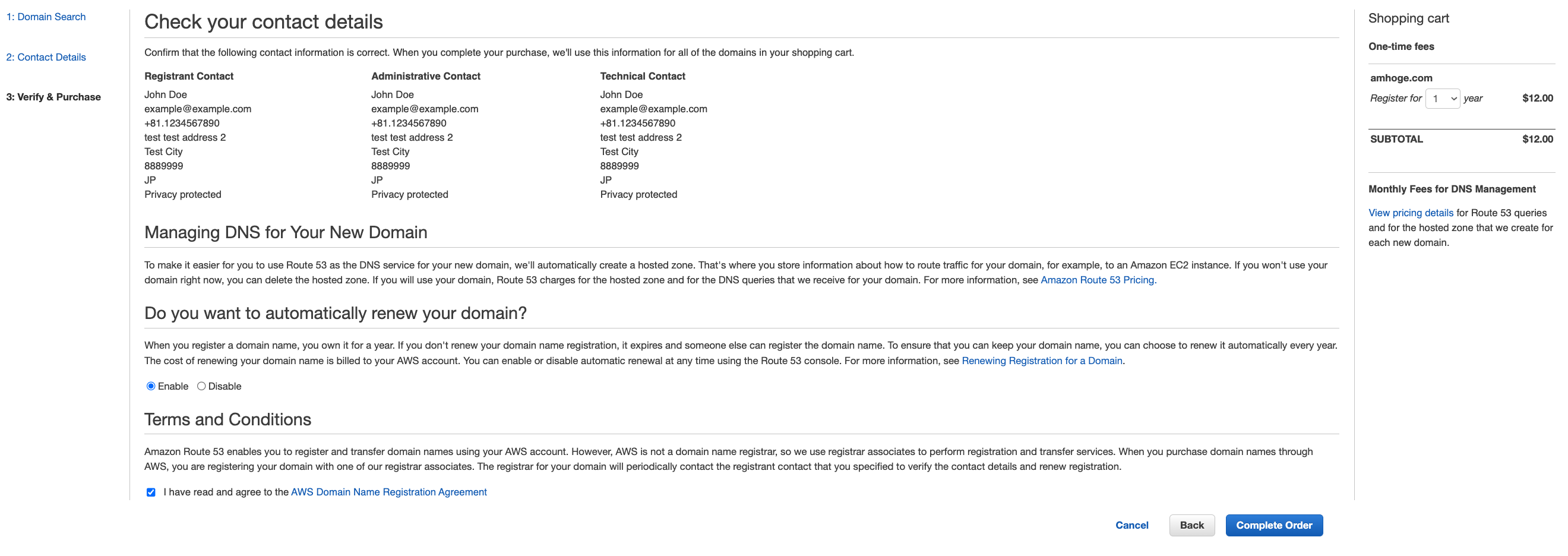Terms and Conditionsを読んで、「I have read and agree to the AWS Domain Name Registration Agreement」にチェックをして購入を完了させます。