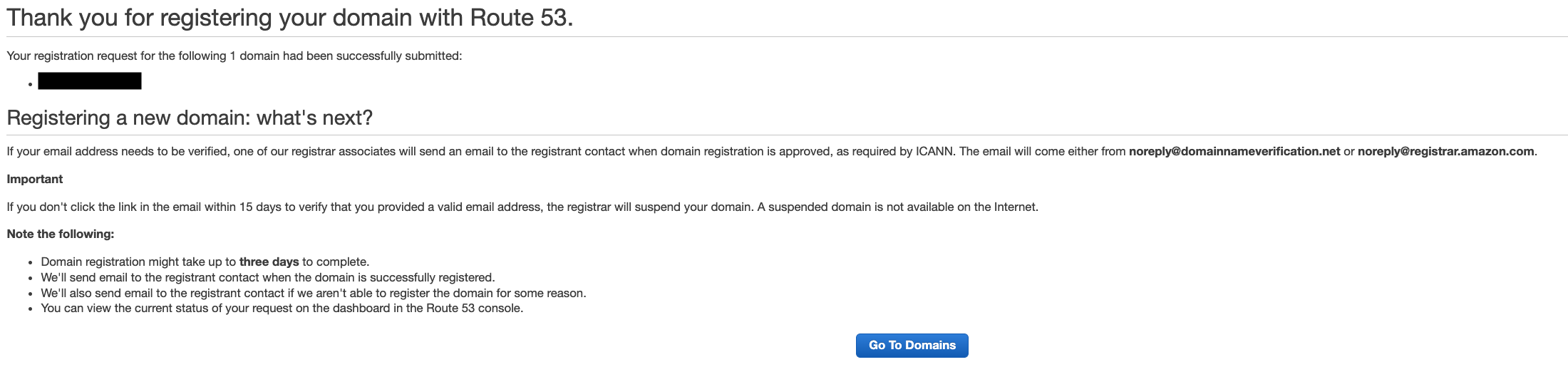 「登録受付しました」の旨が画面に表示されます。10〜15分程度で登録が完了します[3]。登録中のドメインは「Pending requests」に表示されます。登録が完了すれば「Registered domains」に表示されます。