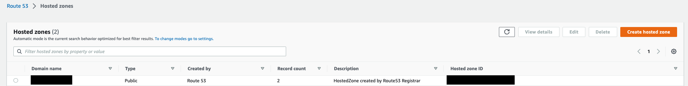 Route 53のHosted zonesから登録したドメイン(リンクになっている)を選択します。