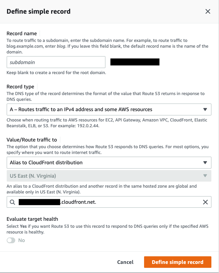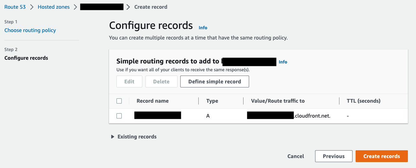 CloudFrontディストリビューションが正しく作成出来ていれば、「Value/Route traffic to」を「Alias to CloudFront distribution」にするとChoose distributionから作成したディストリビューションを選択できます。