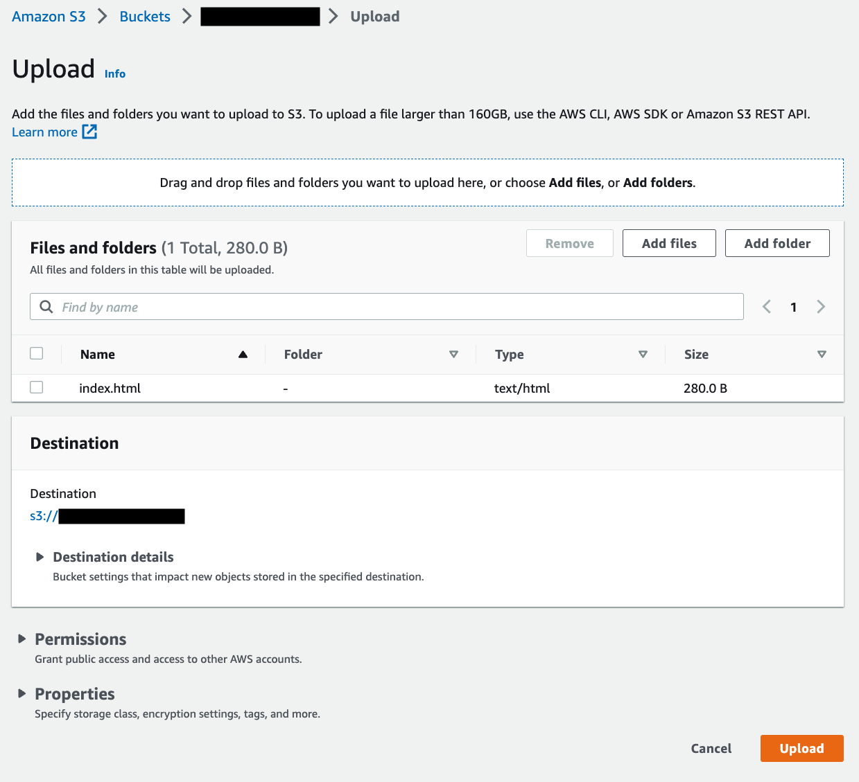#作成したバケット直下にindex.htmlをアップロードします。アップロード画面にファイルをドラッグ&ドロップでアップロードできます。