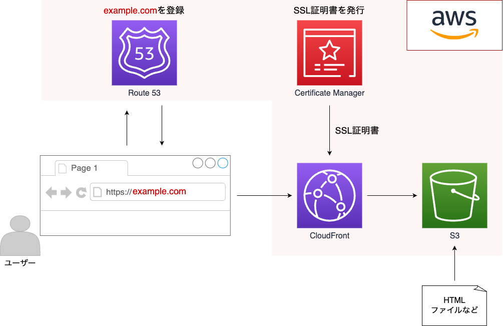 タイトルの「できるだけ簡単に」というのはかなり主観的な表現ですが、ポイントの1つとして「AWSのみで完結させる」という目的があります。と言いますのは、後述するようにドメインとSSL証明書(以下、証明書と記述)の取得にそれぞれRoute 53とCertificate Managerを使っています。これらはAWS以外のサービスでも取得可能なので必ずしもAWSを使う必要が無いものではありますが、AWSだけですべてが実現できるのはとてもシンプルで良いと思います。何より、AWSのサービスを実際に利用して理解することが主目的なので、今回はこれらのサービスを利用することにしました。