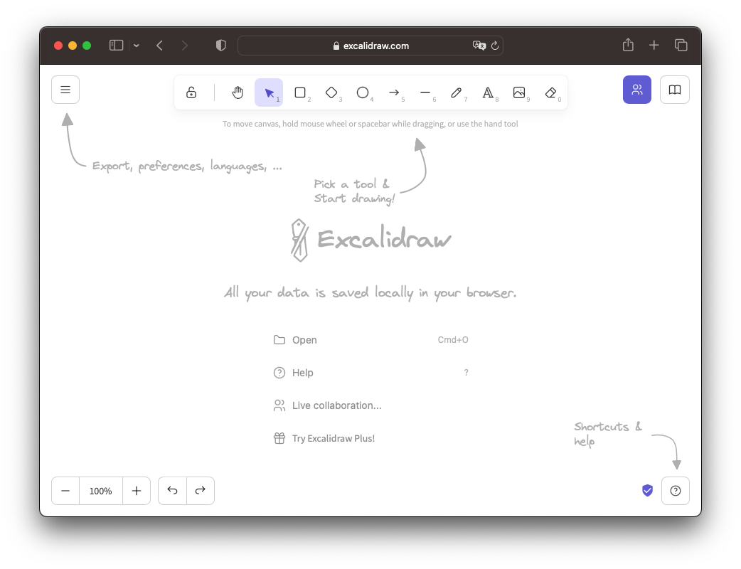 https://excalidraw.com/ にアクセスすれば、ユーザ登録などもなく直ちに使い始められます。