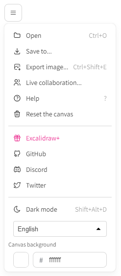 メニューからは、ローカルに保存(.excalidraw という実体はJSONファイル)したり、PNG や SVG などにエクスポートすることができます。ダークモードや日本語への切り替えも行えます。