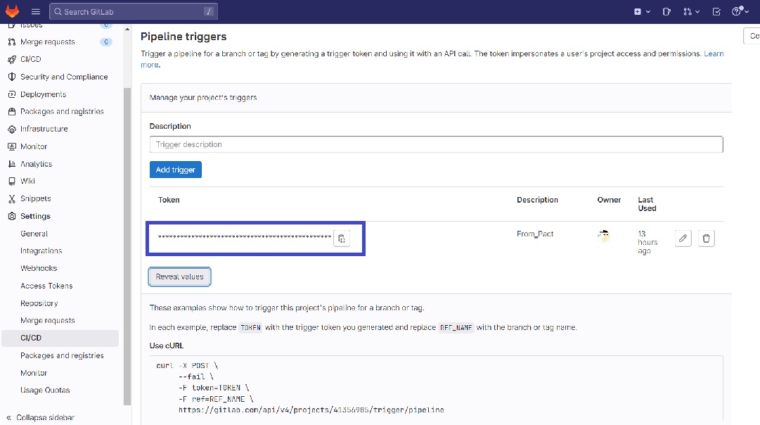 Gitlab側で設定したトリガーを呼び出すWebHookをPactFlow側に設定します。PactFlowを利用する場合は、別途登録したークレット情報を参照してHookを定義できますので、Gitlabのアクセストークンについてはシークレット情報として別途定義しています。