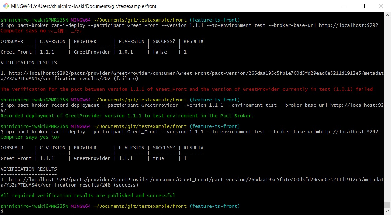 pact-broker can-i-deploy --pacticipant Greet_Front --version 1.1.1 --to-environment test --broker-base-url=<登録先のPact-BrokerURL>