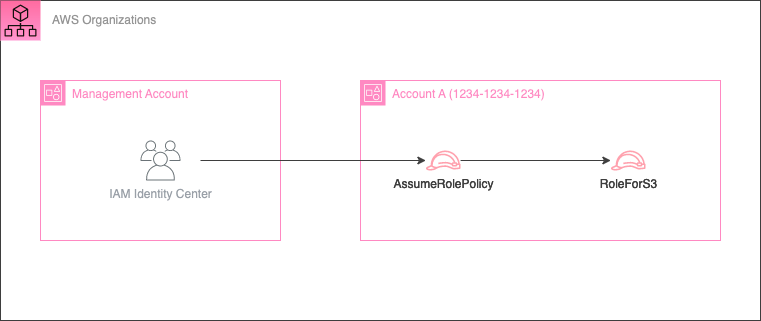 #設定したポリシーは AssumeRole しかできないものです。やりたいことは図のように、S3 へのアクセスが必要な場合は RoleForS3 ロールを受け持つということです。