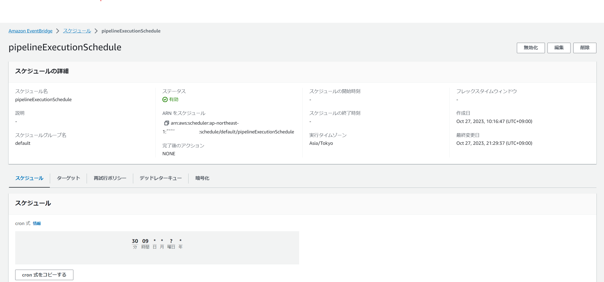 pipelineArnは作成したパイプラインのARN(pipeline.pipelineArn)を指定しています。