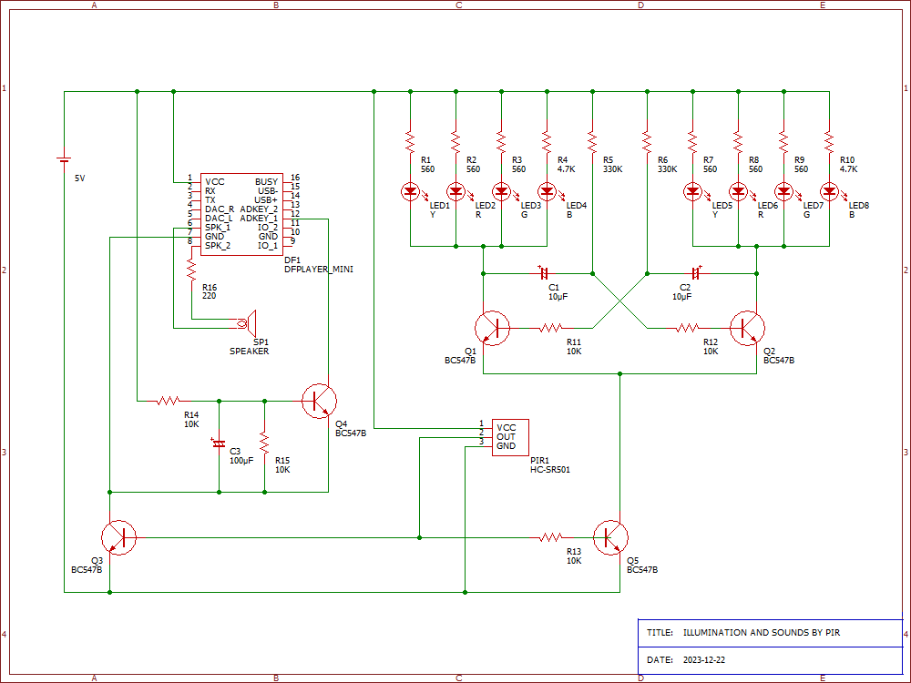 初期バージョンは中央下の人感センサー(PIR1)と右半分の点滅回路のみでしたが、後で左半分の音楽再生回路を追加しました。