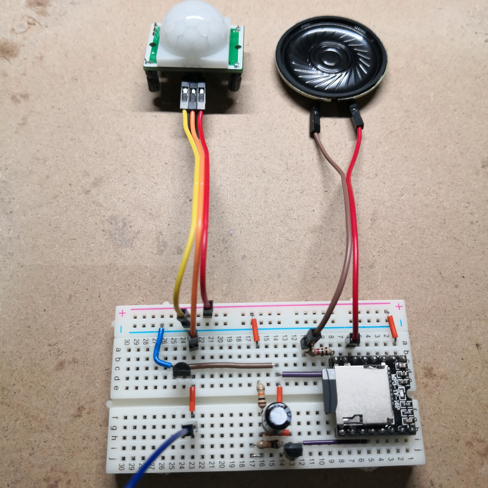 写真のPIR センサーの下にあるトランジスタが回路図のQ3となり、右の音楽再生モジュールの電源スイッチとなります。音楽再生モジュールにはmicroSDが刺さっています。スピーカーのボリュームは抵抗R16の抵抗値で調整しています。
