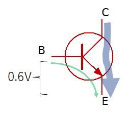 ベース-エミッタ間の電圧が0.6V以上になるとB-E間に電流が流れます。これでスイッチがONとなります。この電流が呼び水となりC-E間に電流が流れるようになります。このときC-E間に流れる電流はB-E間に流れる電流の100倍以上流すことができます。0.6Vを境に小さな電流で大きな電流の量を調整したり、電気的にON/OFF制御できるというわけです。