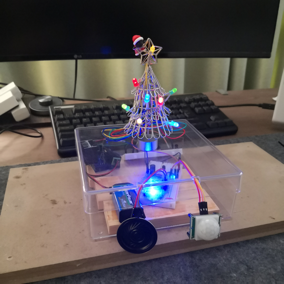 ツリートップの★に某カフェの景品でゲットした黒猫サンタ(ふちねこ)がぶら下がっています。センサーは3メートル程の距離でも反応するのですが、手をかざして人を感知して鳴っていることをアピールしています😀