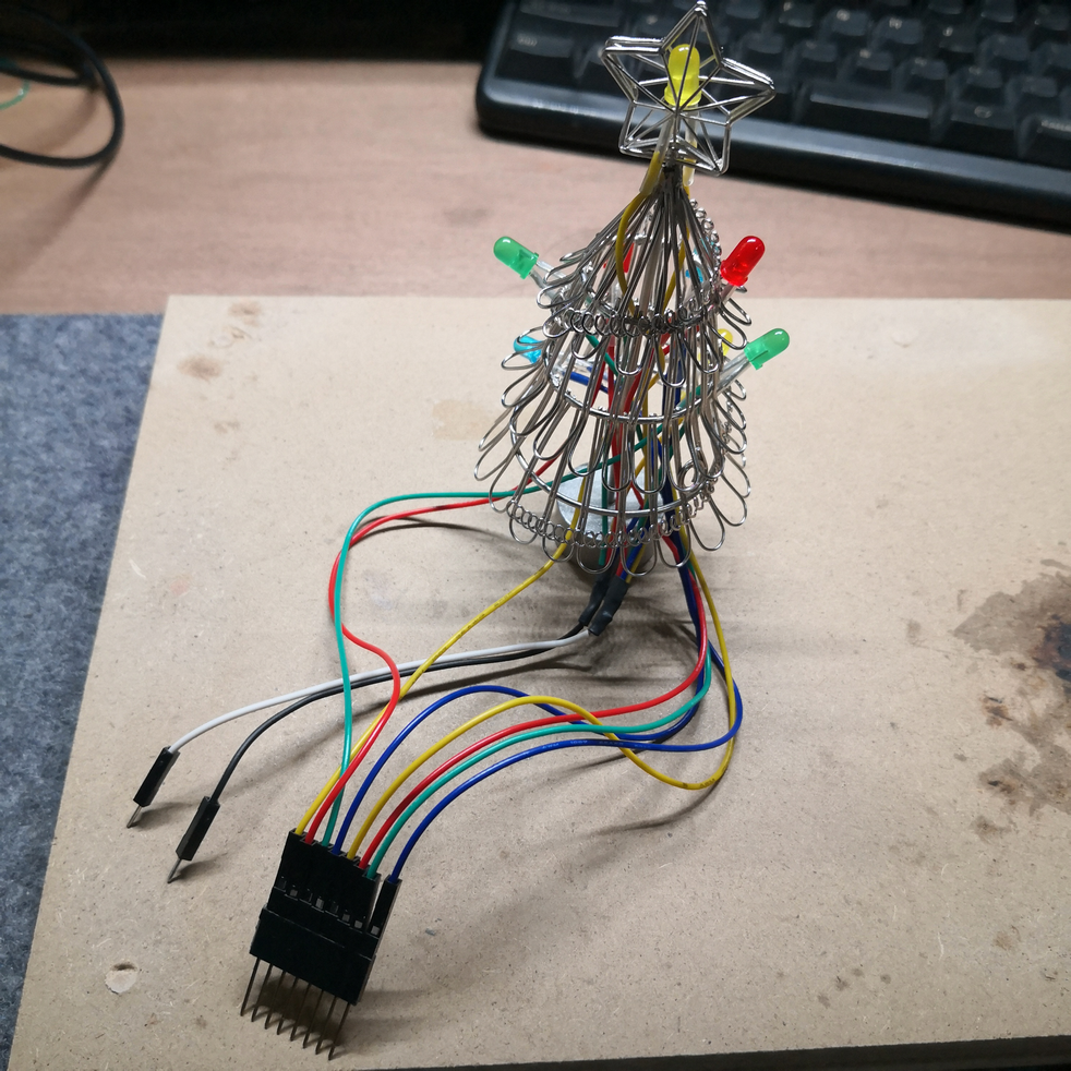 当初、ツリー自体をGND(0V)として全LEDのカソード(マイナス端子)をツリーに接続することでワイヤー数を削減しようと思っていました。しかしLEDを交互に点滅させる回路の仕組み上、1つのGNDとはできない(知識不足)ため系統ごとGNDをまとめました。最終的には計10本のワイヤーで回路に接続するよう修正しました。