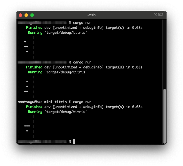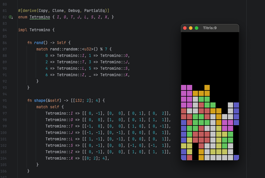 この定義は、既存の impl Tetromino { ... } の中に含めても良いですし、上記コードをそのままソース・ファイルに追記しても良いです。