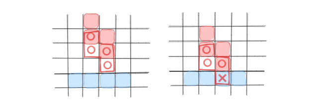 続く for ループでは、現在の落下ブロックを描画します。ブロックを構成する4つの単ブロックに対して、draw_square() をpixmap 、ブロックの x, y 座標、ブロックの種類(Tetromino)を引数として渡しています。