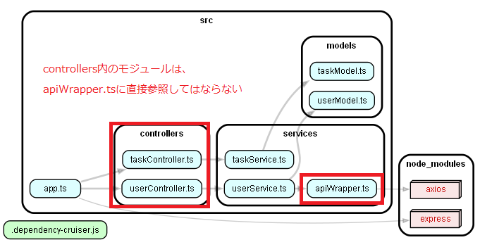 - **to**: 依存先のパスを正規表現で指定します。`apiWrapper.ts`への直接の依存を禁止します。
