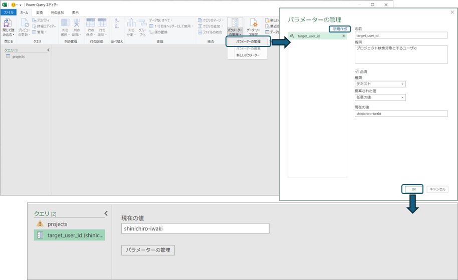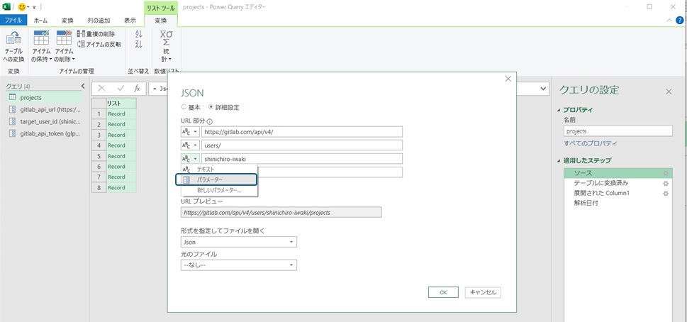 taro-yamadaさんのプロジェクト集計用にクエリを作り直しても良いのですが、取得したデータに対する同じ処理を何度も作ることは無駄な労力ですので、APIのユーザーID部分だけを切り替えて使えるようにできると便利です。このようなケースにはPowerQueryの「パラメータ」を利用できます。数学で出てきた変数xなどのように、「パラメータ」の設定箇所にはその「パラメータ」値が反映されます。例えばユーザーIDをtarget_user_idという名前のパラメータを使用するようにすればパラメータの値を切り替えるだけで指定したユーザーのプロジェクト一覧が取得できるようにクエリを変更できます。