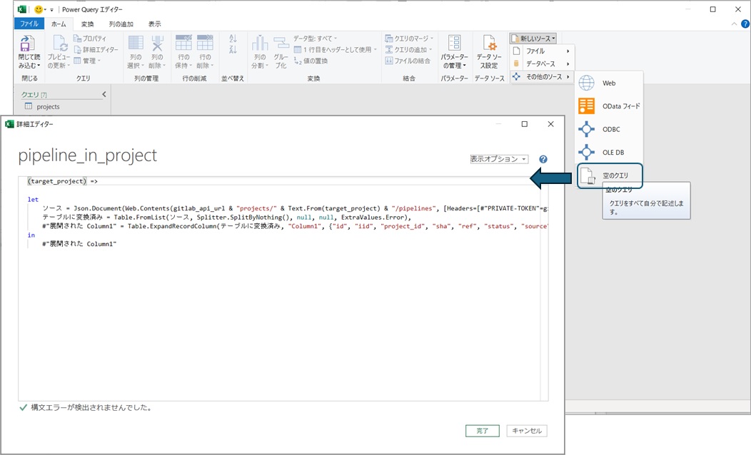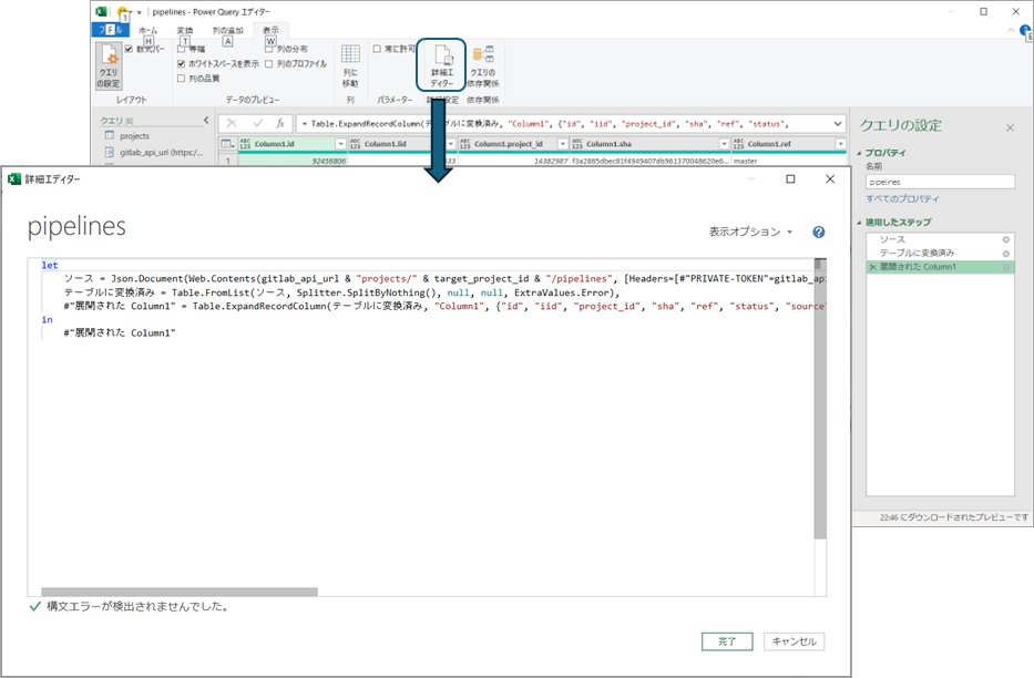 このように「あるクエリAの結果を用いて別のクエリBを使用」したい場合には、クエリBと同等の処理をするカスタム関数を作成してクエリAのステップの中で呼び出すことが可能です。これには多少のコーディング作業が必要になりますのでパイプライン一覧を取得するクエリの内容を確認してみます。リボンメニューの「詳細エディター」を選択すると選択しているクエリのソースコードが確認できます。