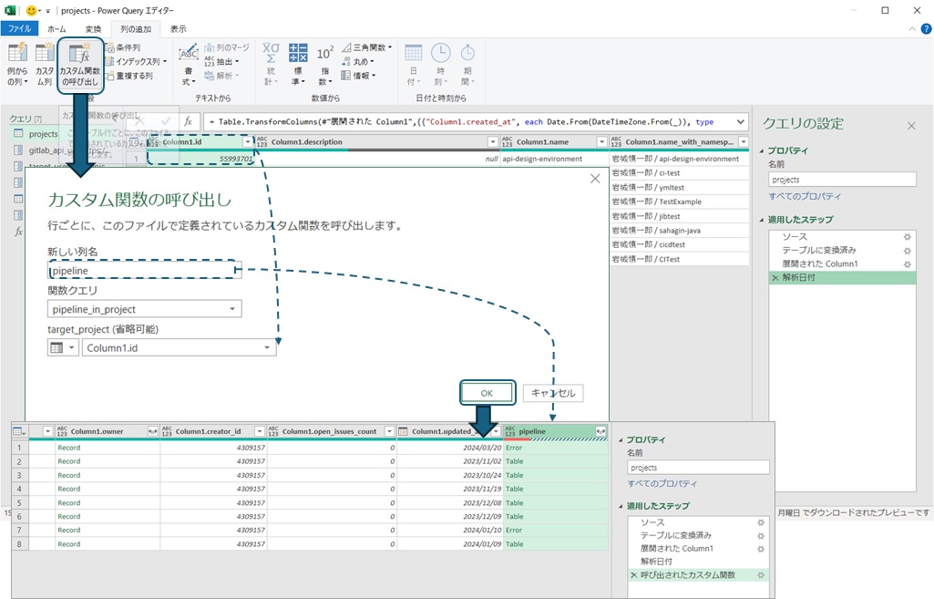 作成したクエリはエディタ上で入力値を指定して実行できますが、「関数」のため別のクエリから呼び出すこともできます。今回はプロジェクトのIDを入力にパイプラインの情報を取得してデータに追加したいので、「列の追加」メニューからカスタム関数の追加を選択します。新しい列名が追加される列の名前になるので分かり易い名前を入力して作成したクエリを選択します。今回のクエリは入力値target_projectを設定しているので、クエリを選択すると入力値を設定できるようになります。ここに元のデータ中にあるプロジェクトのIDの列名(Column1.id)を設定すると行ごとにプロジェクトIDを入力にしたパイプラインの一覧が取得できます。