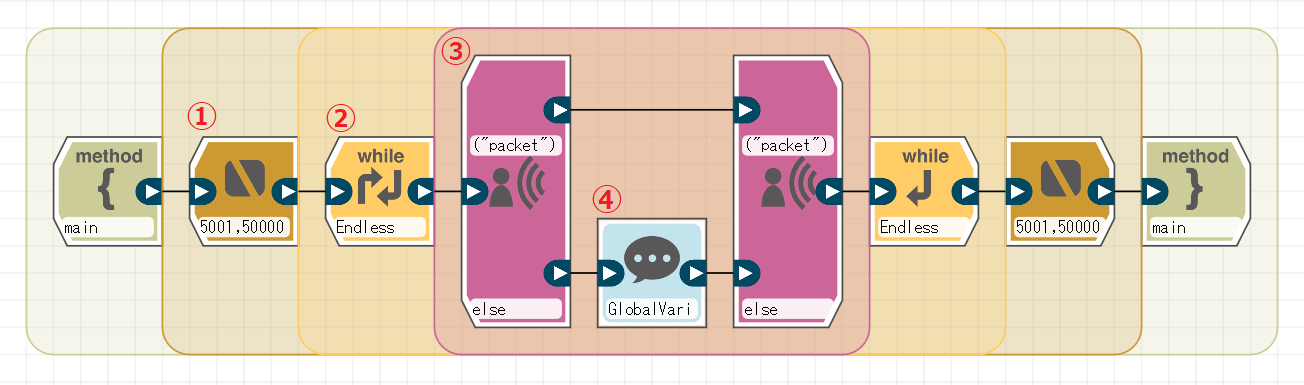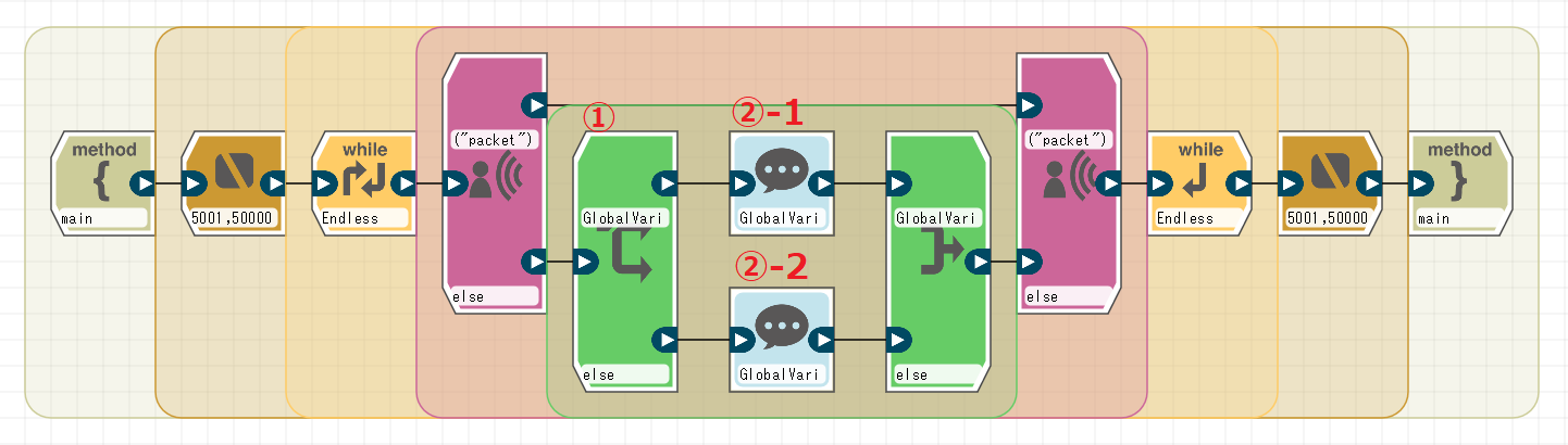 TCP/IPサーバ受信ブロックはこのブロックの開始・終了の間に入れる必要があります。