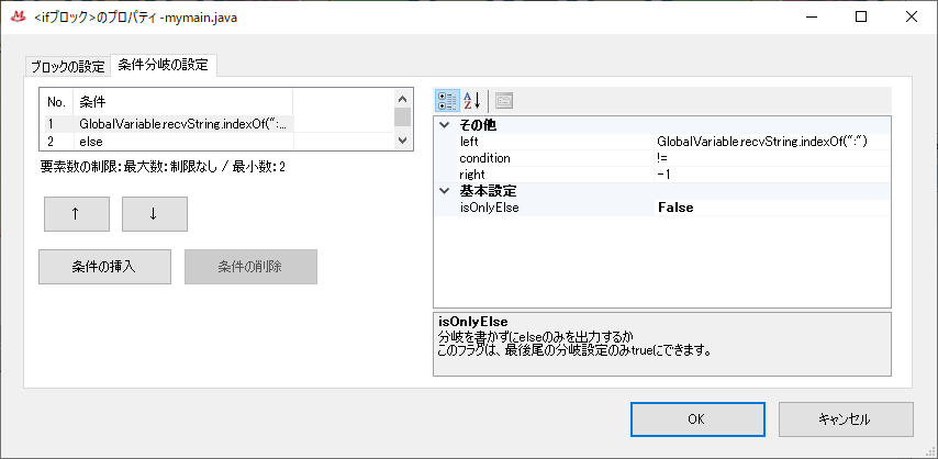 ifブロックをダブルクリックして表示される「<ifブロック>のプロパティ」画面の「条件分岐の設定」タブの画像を以下に添付します。