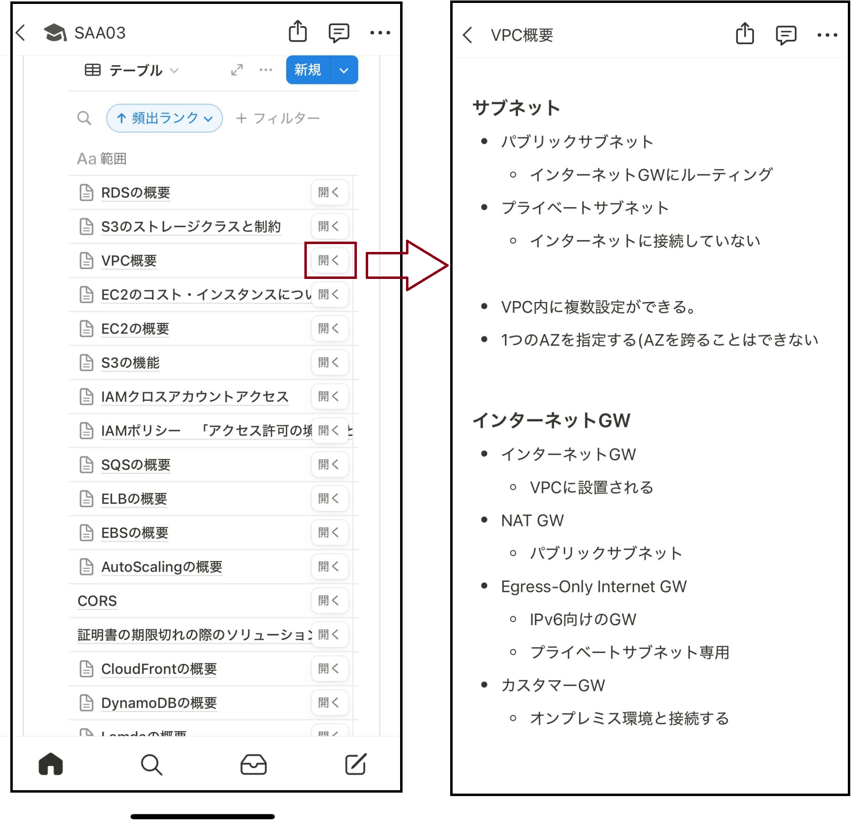 筆者が作成したNotionのiPhone16上での画面です。テーブル画面の「開く」を押すことで、紐づけたMarkownが閲覧できます。