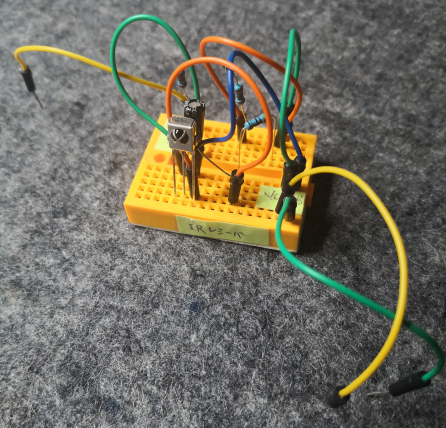 左の黄色のラインが赤外線受信データを出力するOutputで、右の黄色が電源で、緑がGNDです。