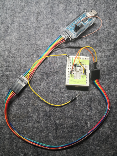 白いブレッドボードがシリアル通信する回路です。黄色い1本の線をATtiny13AのPB3(pin2)に繋ぎ、ボーレートを115200にします。オレンジと黄色の線をUSB-シリアル変換アダプターのTX/RXに接続し、USBをPCに接続してTera Term等で表示します。