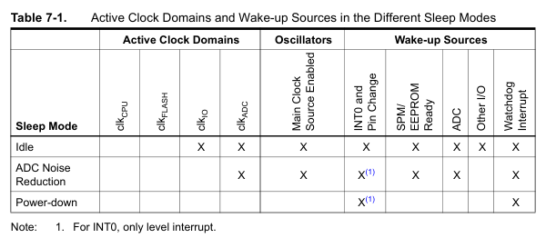 スリープモードは SLEEP_MODE_IDLE, SLEEP_MODE_ADC, SLEEP_MODE_PWR_DOWN の3種類があり下記表のような動作となっています。
