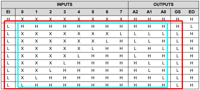 SN74HC148Nのデータシート(仕様書)[2]を見ると入力と出力の対応は以下の表となります。