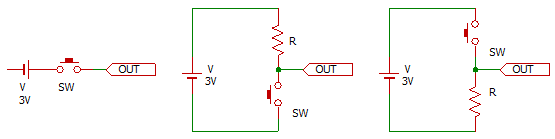 SWがOFFの状態のときは電源電圧3VがOUTに掛かります。OUTには電源電圧と抵抗値Rに応じた電流(V/R)が流れます。SWをONにするとOUTは0Vになります。