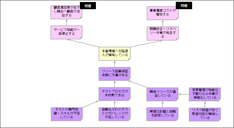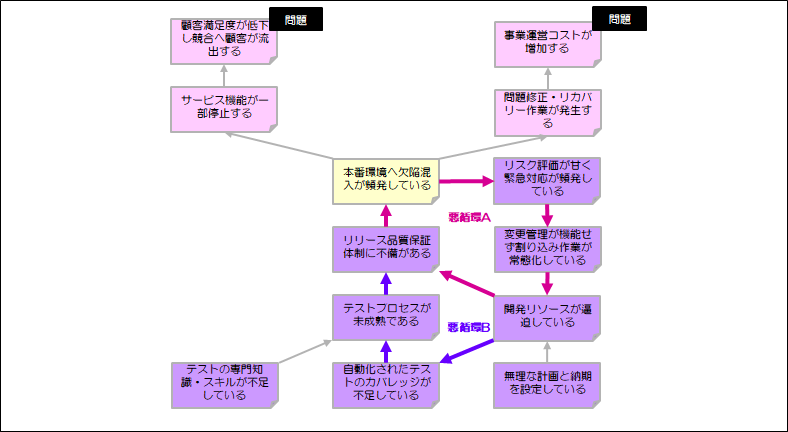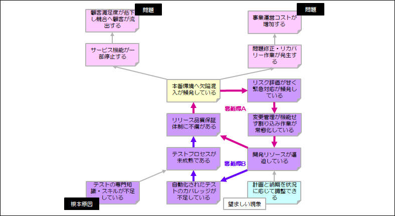 たとえば「変更管理の混乱」「品質保証体制の不備」などは🟣原因として扱い、