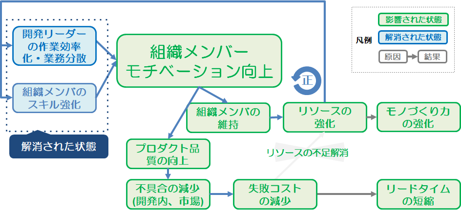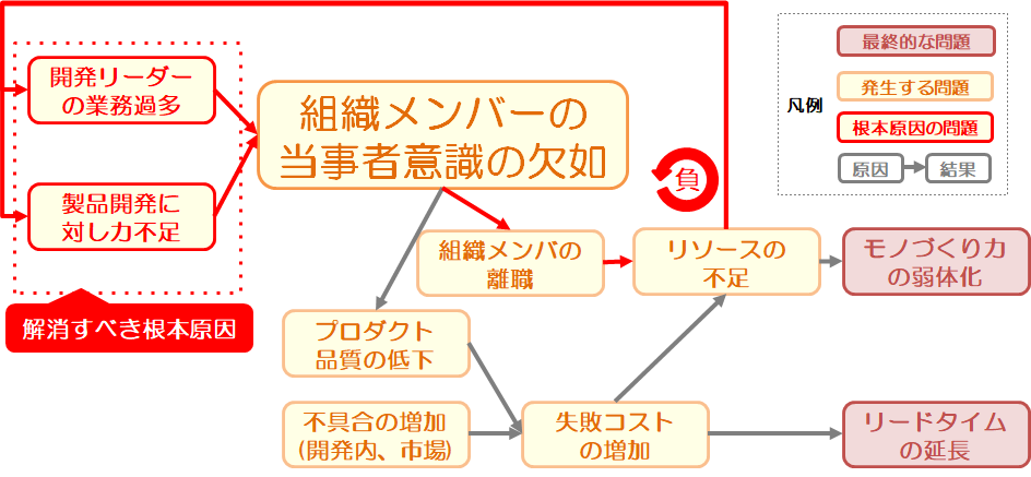 #問題を整理すると、「開発リーダーの業務過多」と「製品開発に対する力不足」という2つの根本原因に集約されました。