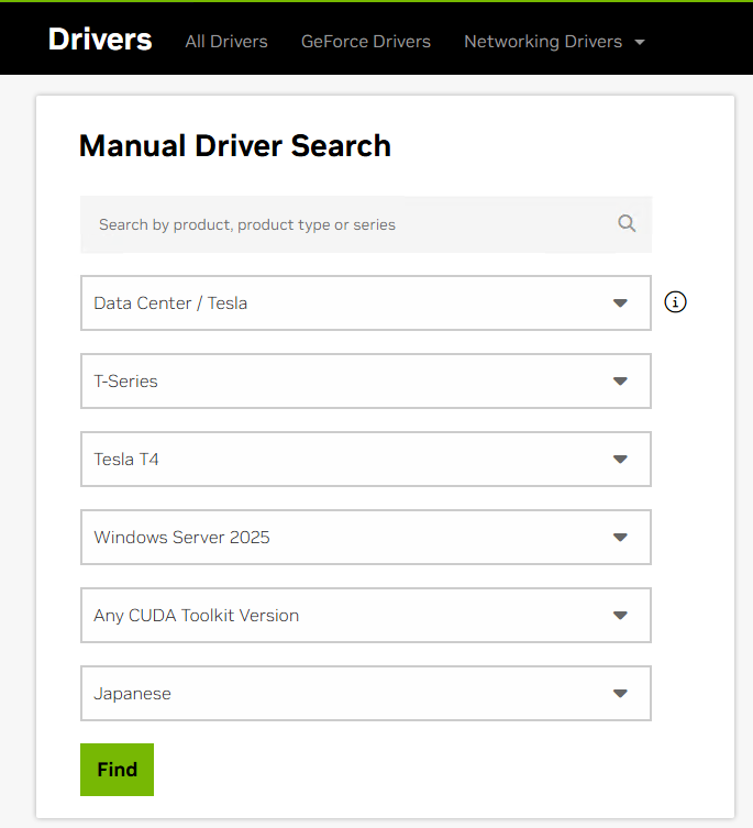 g4dnインスタンスに搭載されているGPUは Tesla T4 なので、以下の通り検索します。- 検索結果から最新のドライバーをダウンロードします。